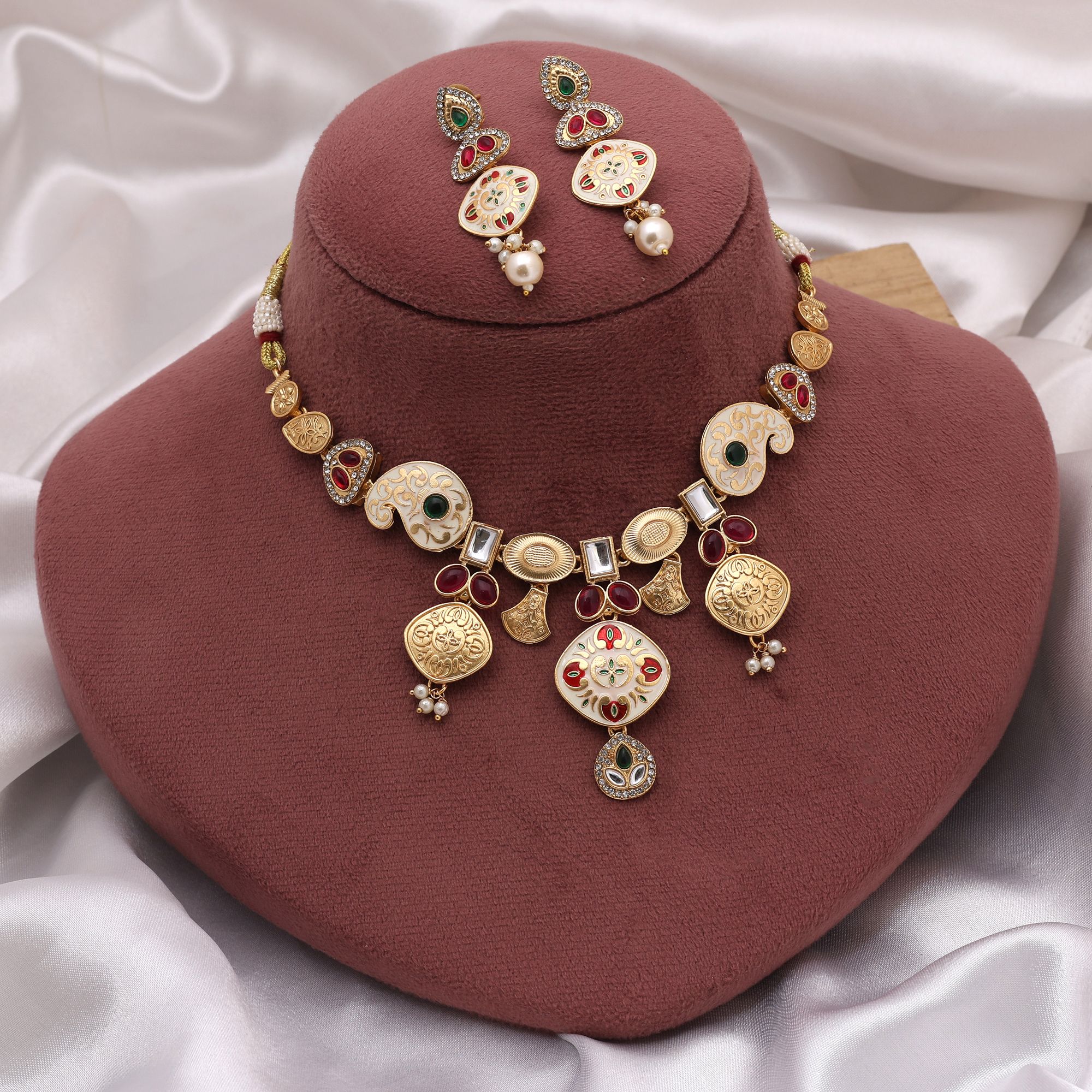 Add a touch of timeless elegance to your festive look with this multi-color Meena work matte gold necklace set, inspired by traditional handcrafted Indian jewelry. The set features an adjustable rope necklace and matching drop earrings, beautifully designed to complement ethnic outfits for weddings, festivals, and special occasions.