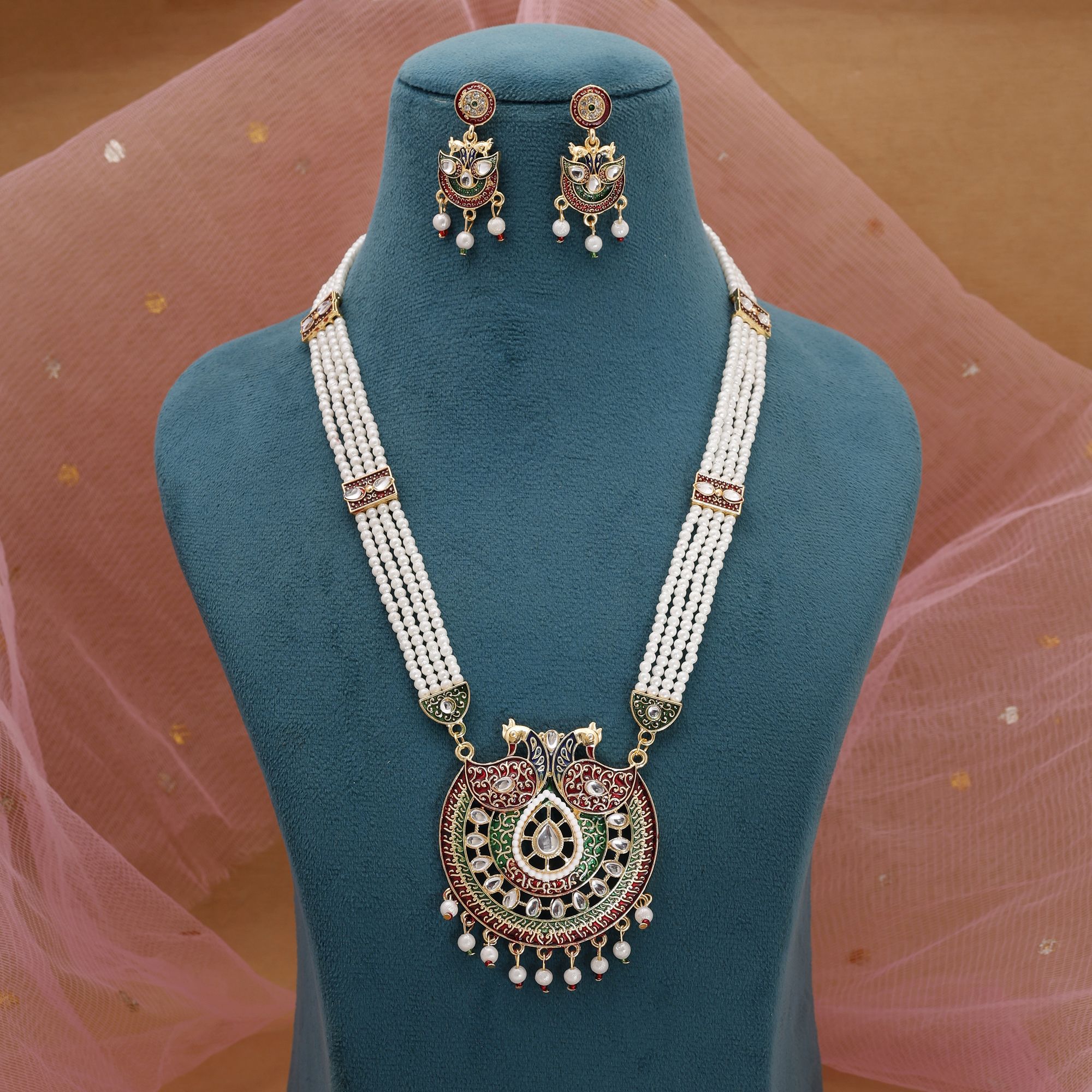 Multi Color Meena Work Rajputi Jewellery Rani Haar set featuring an artistic look with Kundan and bead work. Comes with an adjustable rope necklace, matching dangle earrings, and premium gold-plated alloy metal for a royal traditional finish.