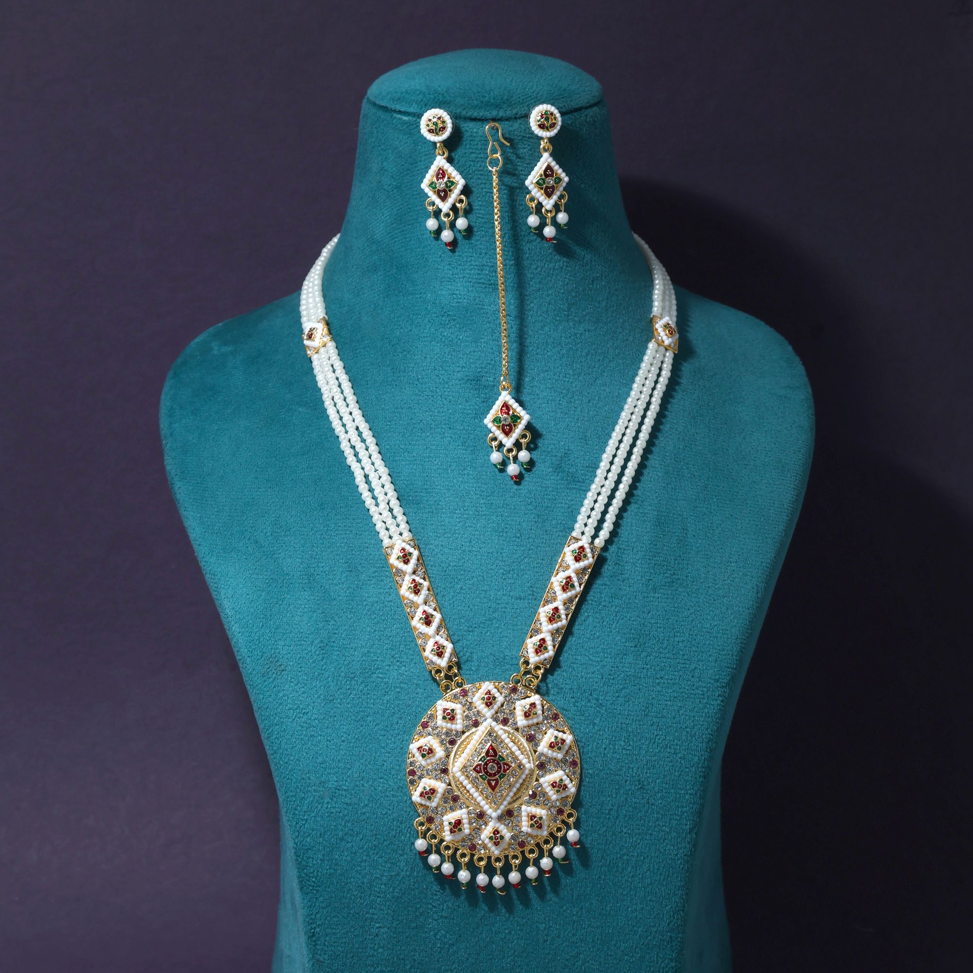 • Coordinated set with necklace, earrings, and maang tikka