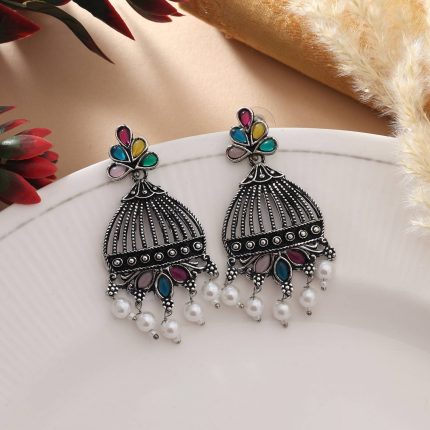 Oversized Silver Color Jhumka Oxidised Earrings With Hanging Dome Charms – Silver