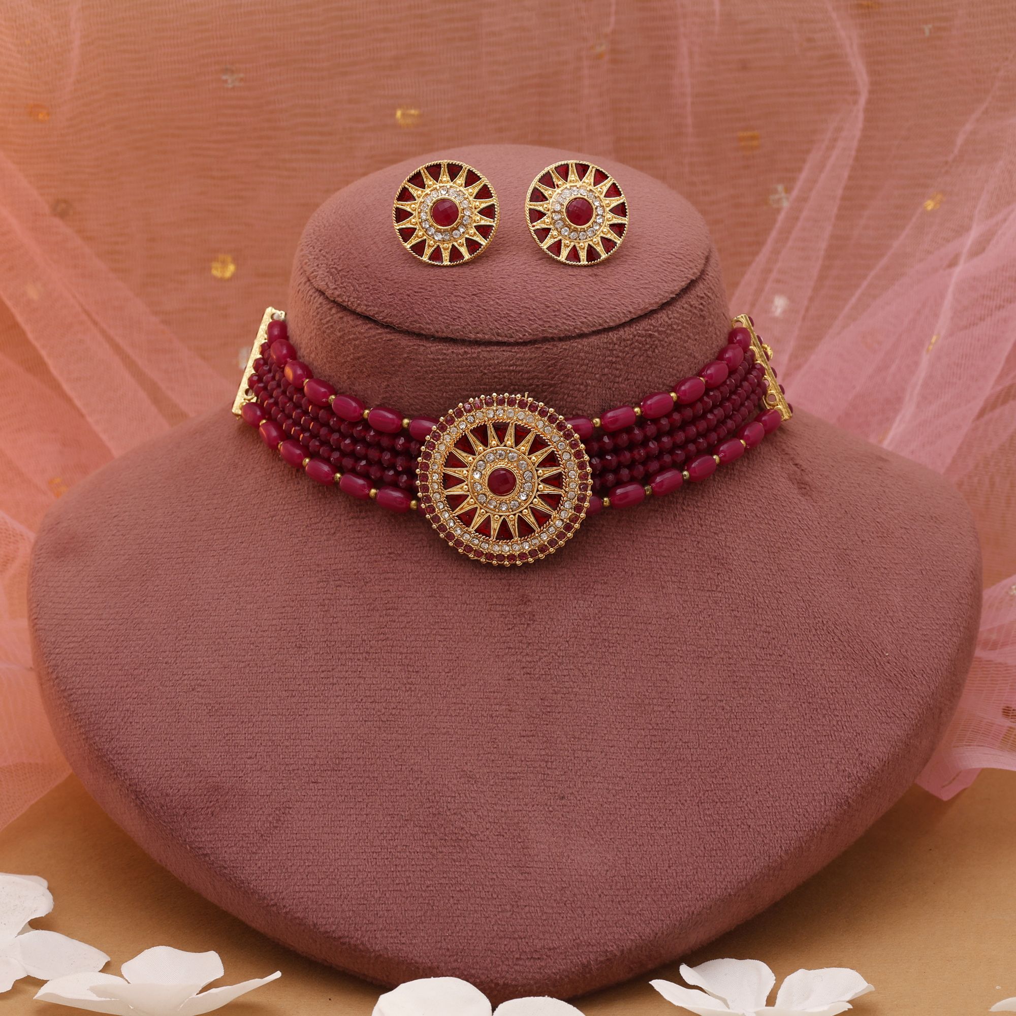 Made from alloy with good-quality gold plating, this set has a rich, traditional finish. The vibrant rani and red colors are enhanced with rhinestones and beads, giving the jewellery a sparkling, royal appeal. Despite its luxurious look, the set is comfortable to wear, with a gross weight of 40.00 grams.