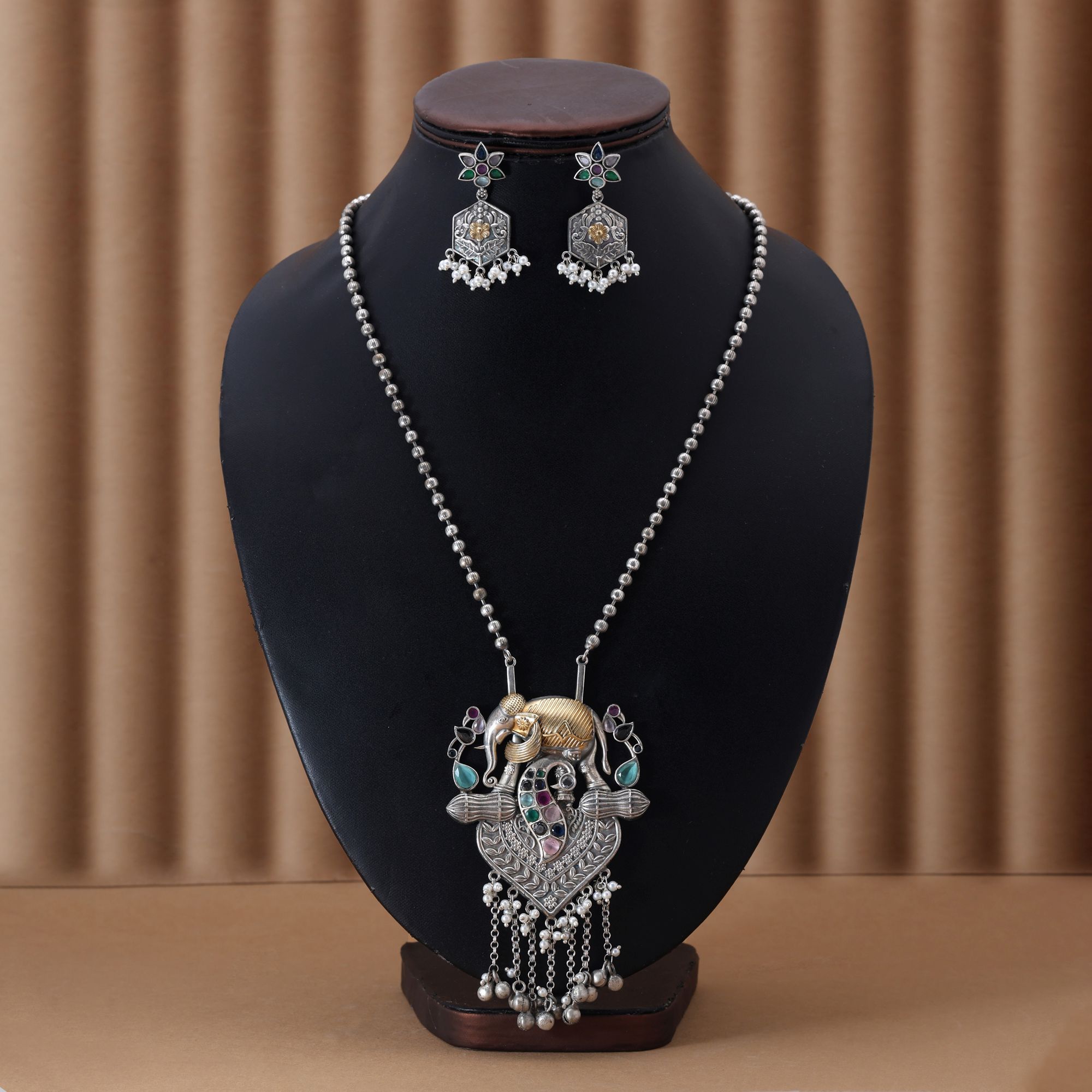 A beautifully crafted oxidised necklace set designed to bring bold elegance, mirror shine, and timeless ethnic charm to your jewelry collection.